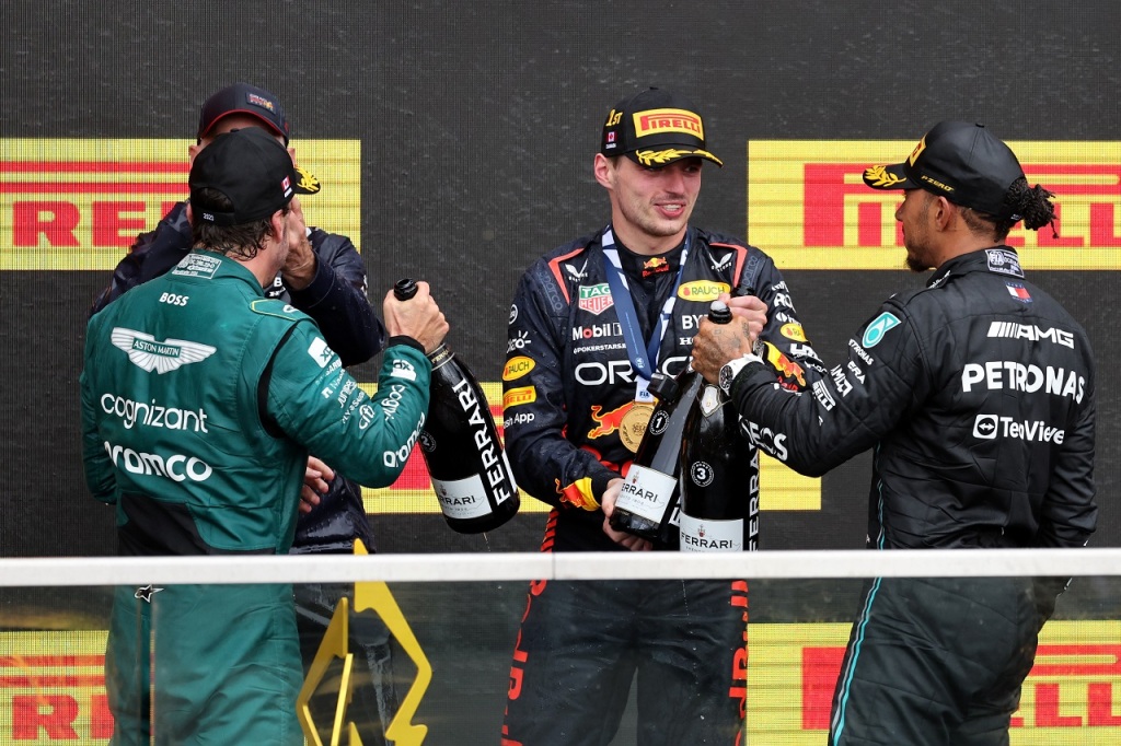 2023年F1第9戦カナダGP表彰台 優勝マックス・フェルスタッペン(レッドブル)、2位フェルナンド・アロンソ(アストンマーティン)、3位ルイス・ハミルトン(メルセデス)