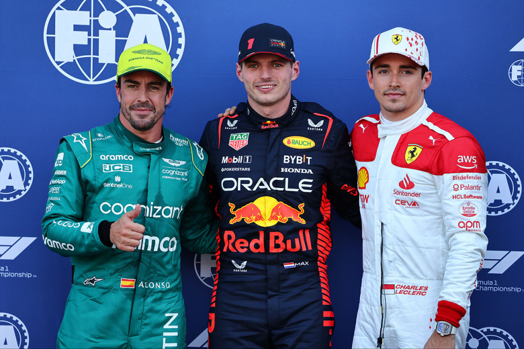 2023年F1第7戦モナコGP 予選2番手のフェルナンド・アロンソ、予選PPのマックス・フェルスタッペン、予選3番手のシャルル・ルクレール