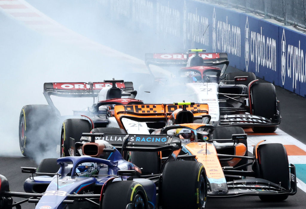 2023年F1第5戦マイアミGP スタート直後、ランド・ノリス(マクラーレン)に追突するニック・デ・フリース(アルファタウリ)