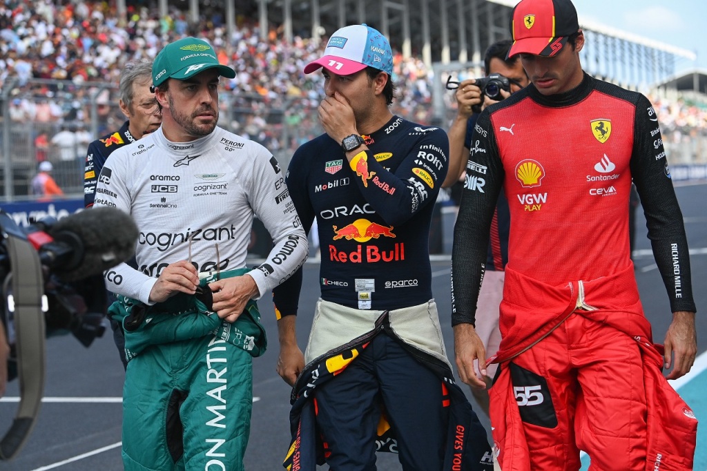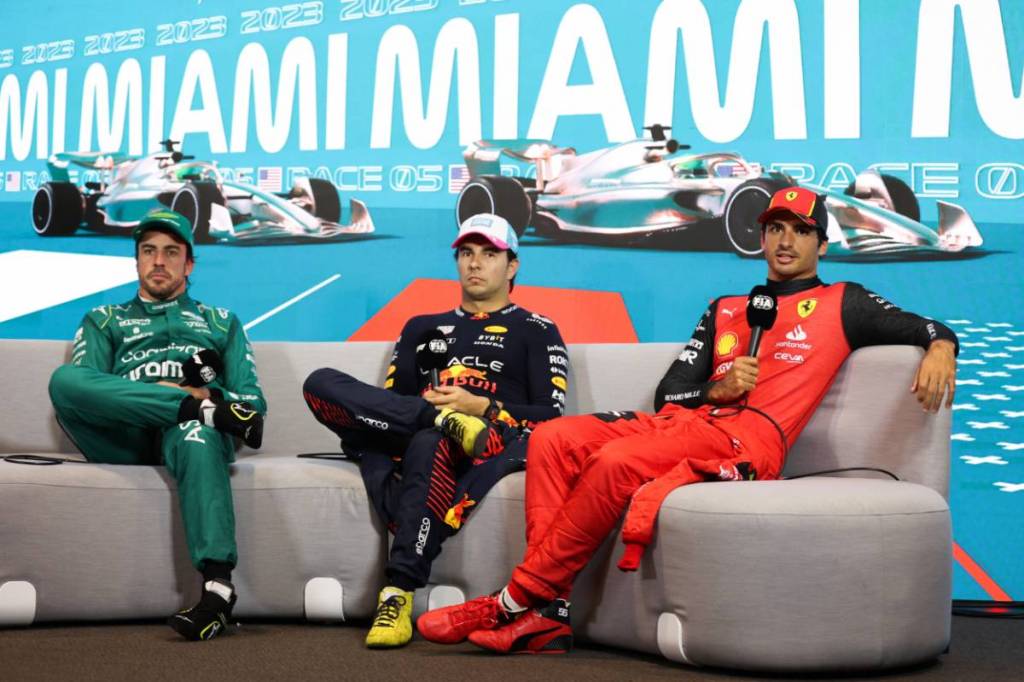 2023年F1第5戦マイアミGP予選後会見 PPセルジオ・ペレス(レッドブル)、2番手フェルナンド・アロンソ(アストンマーティン)、3番手カルロス・サインツ(フェラーリ)