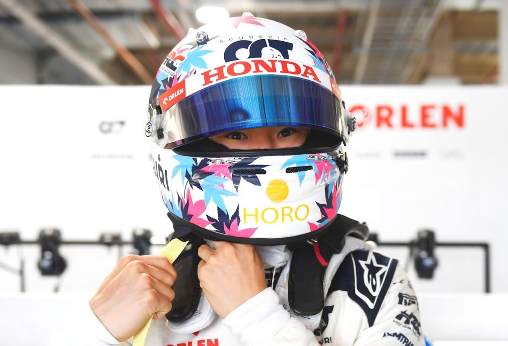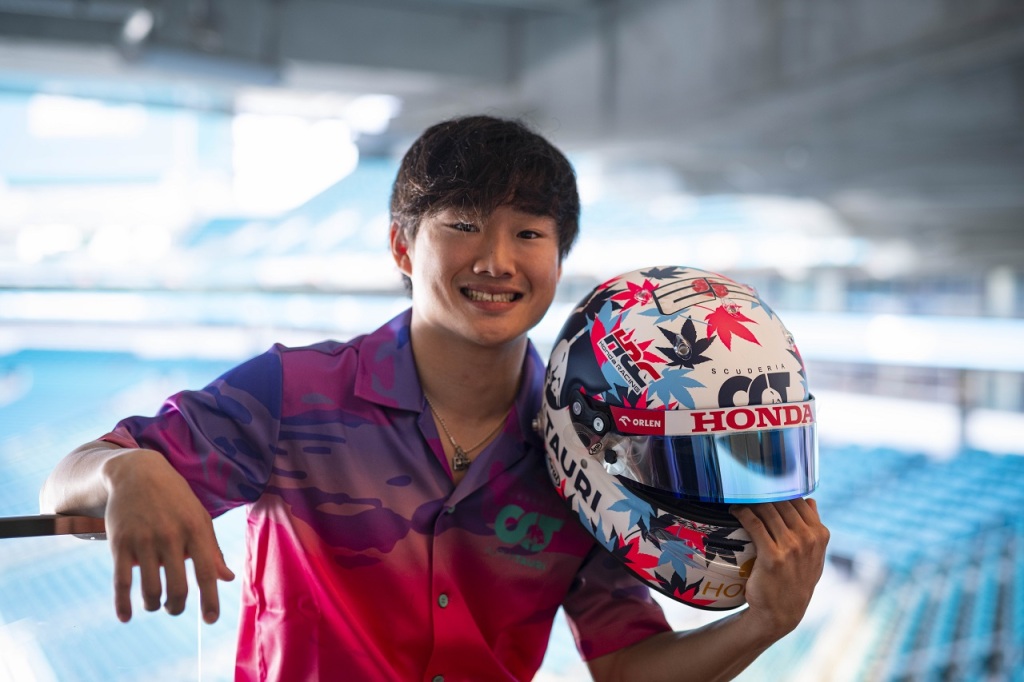 2023年F1第5戦マイアミGP 角田裕毅(アルファタウリ)がマイアミ特別カラーのヘルメットを披露