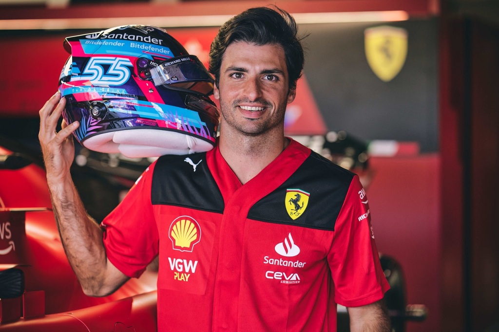 2023年F1第5戦マイアミGP カルロス・サインツ(フェラーリ)とマイアミスペシャルカラーのヘルメット