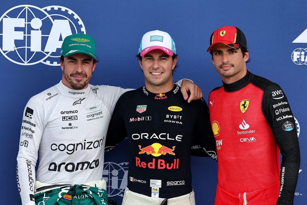 2023年F1第5戦マイアミGP フェルナンド・アロンソ(アストンマーティン)、セルジオ・ペレス(レッドブル)、カルロス・サインツ(フェラーリ)