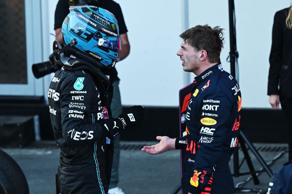2023年F1第4戦アゼルバイジャンGP スプリント後、ジョージ・ラッセル(メルセデス)に抗議するマックス・フェルスタッペン(レッドブル)