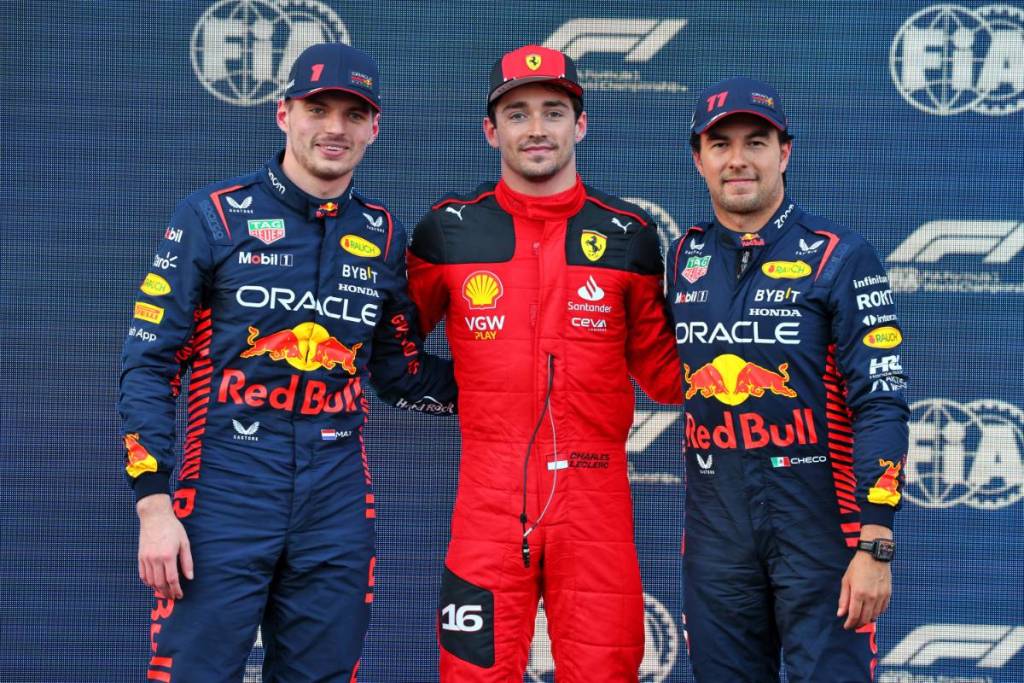 2023年F1第4戦アゼルバイジャンGP予選 PPシャルル・ルクレール(フェラーリ)、2番手マックス・フェルスタッペン(レッドブル)、3番手セルジオ・ペレス(レッドブル)