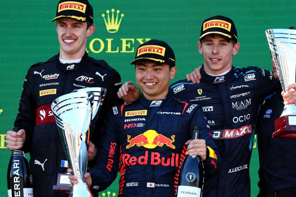 2023年FIA F2第3戦メルボルン レース2表彰式 優勝 岩佐歩夢(ダムス)、2位テオ・プルシェール(ARTグランプリ)、3位アーサー・ルクレール(ダムス)