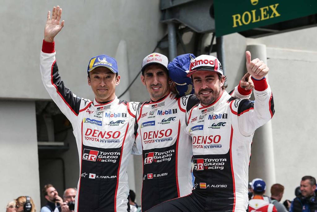 2018/19年のWECで8号車トヨタTS050ハイブリッドをドライブした中嶋一貴(左)とセバスチャン・ブエミ(中央)、フェルナンド・アロンソ(右)