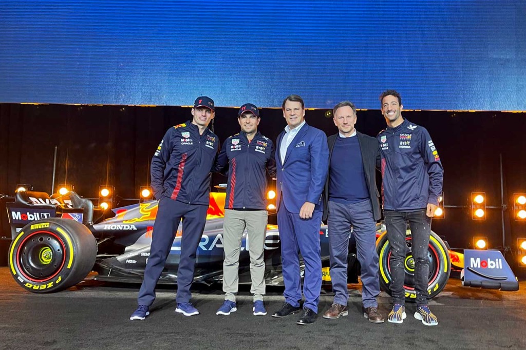 アメリカ・ニューヨークで行われたレッドブルRB19の発表会に登壇したマックス・フェルスタッペン、セルジオ・ペレス、フォードのジム・ファーリー社長兼CEO、クリスチャン・ホーナー代表、ダニエル・リカルド