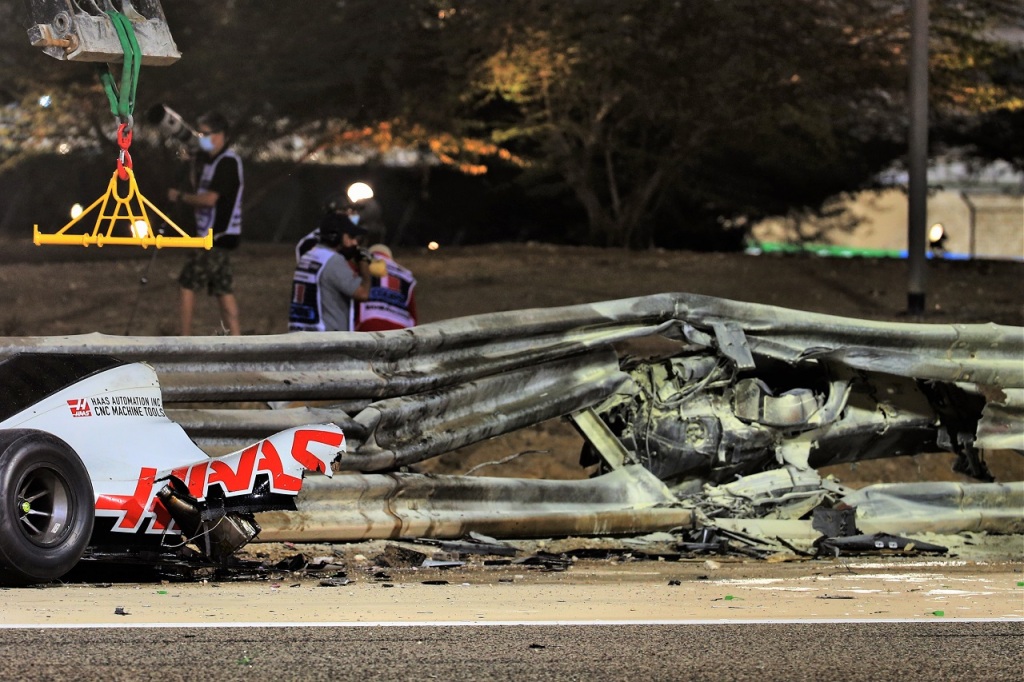 2020年F1第15戦バーレーンGP決勝 ロマン・グロージャン(ハース)が大クラッシュ。マシンが真っ二つに