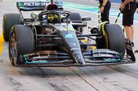 軽量化を目指し、2021年シーズン以来、2年ぶりにブラックのカラーリングになったメルセデスF1。2023年型マシン『W14』は、一部は黒い塗装を施しているが、サイドポッド周辺はカーボンファイバーがむき出しとなっており、塗料分がそのまま軽量化に貢献しているというわけだ。