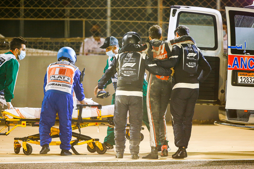 2020年F1第15戦バーレーンGP決勝 ロマン・グロージャン(ハース)が大クラッシュ。マシンが真っ二つに