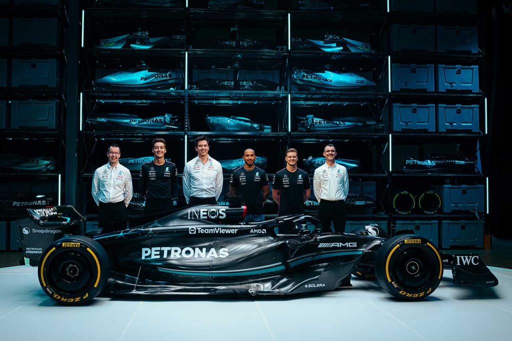 メルセデスF1の2023年型マシン『W14』発表会に登場したドライバーとチーム首脳陣
