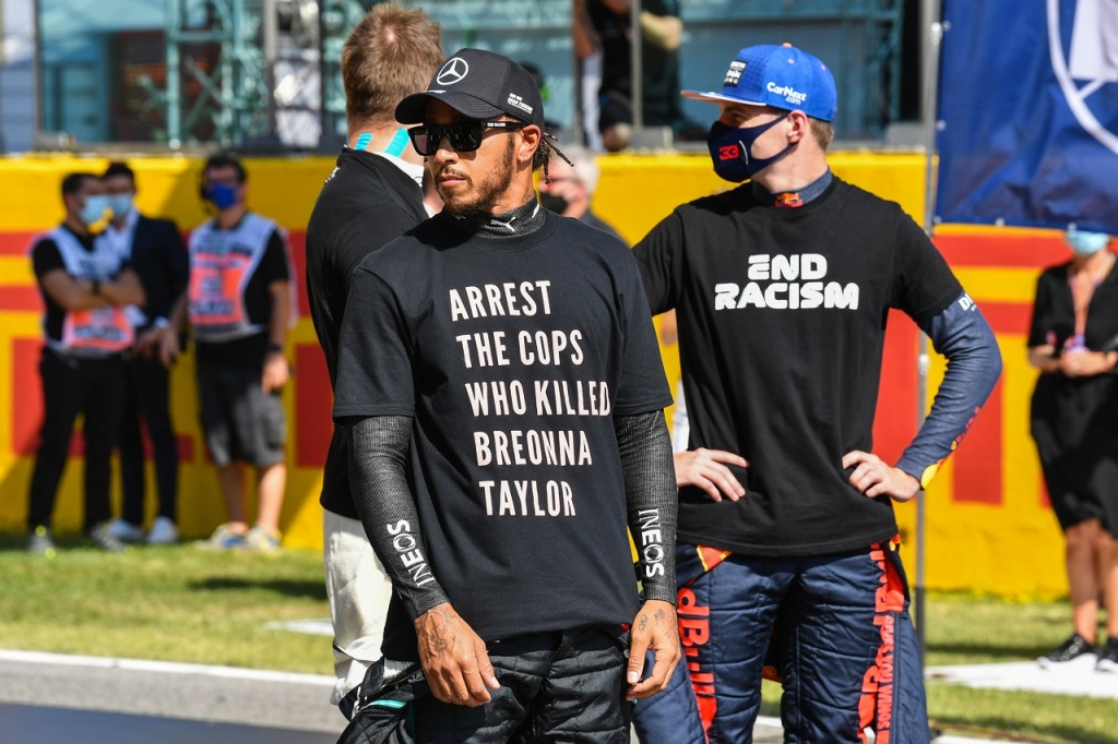 2020年F1第9戦トスカーナGP ルイス・ハミルトン(メルセデス)、ブレオナ・テイラーさんを殺害した警官への抗議の意向を示すTシャツを着用
