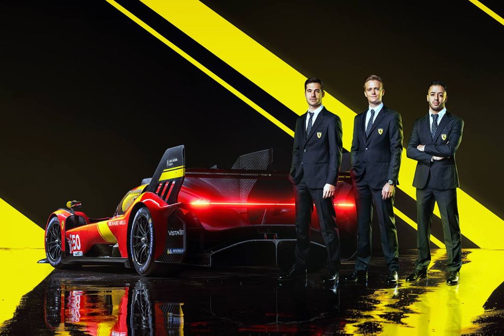 1月10日に発表された51号車フェラーリ499Pのドライバーラインアップ。左からジョビナッツィ、カラド、ピエール・グイディ