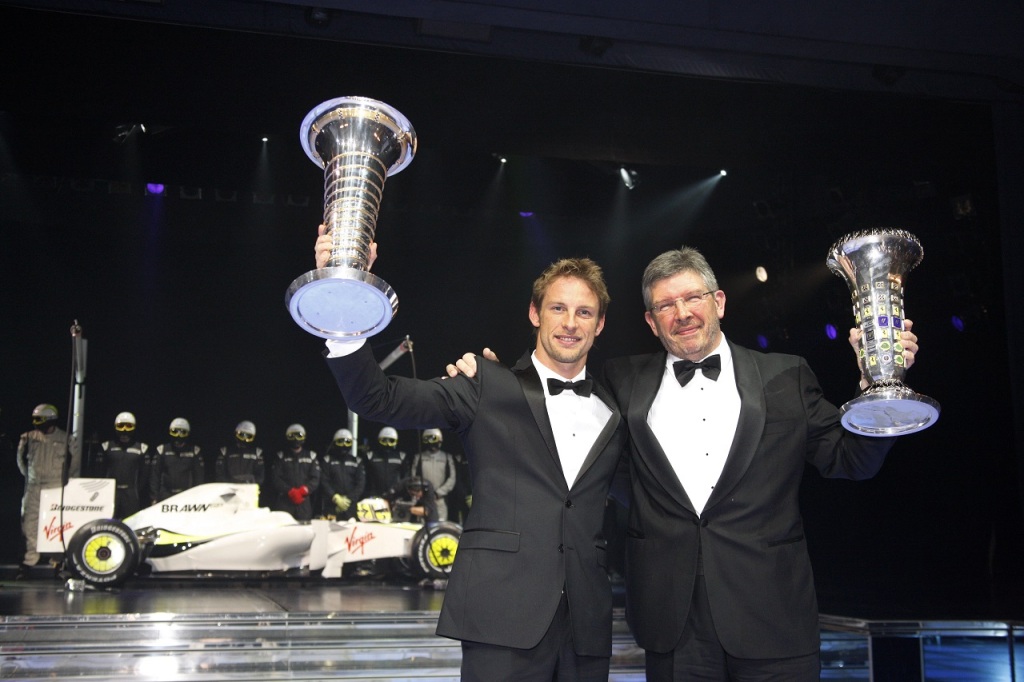 2009年FIA表彰式でのチャンピオン、ジェンソン・バトンとロス・ブラウン(ブラウンGP)