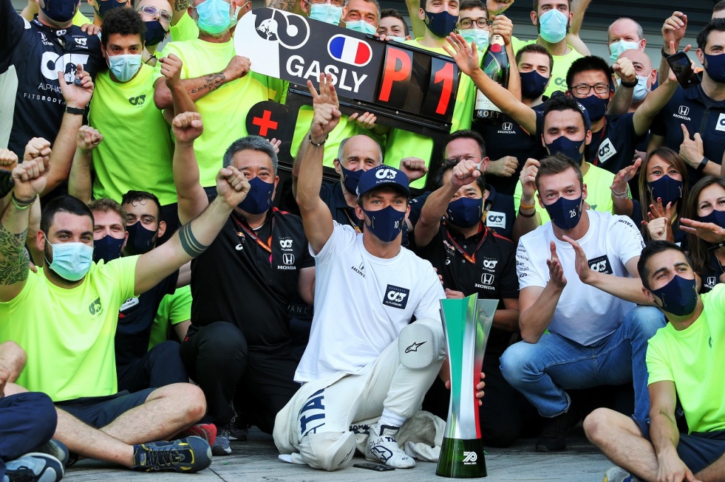 2020年F1第8戦イタリアGP ピエール・ガスリー(アルファタウリ・ホンダ)が初勝利をチームと祝う