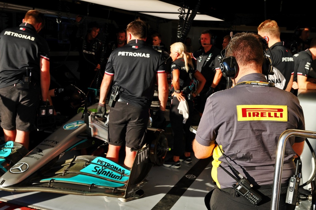 2022年F1第19戦アメリカGP メルセデスのガレージで見守るピレリの担当者