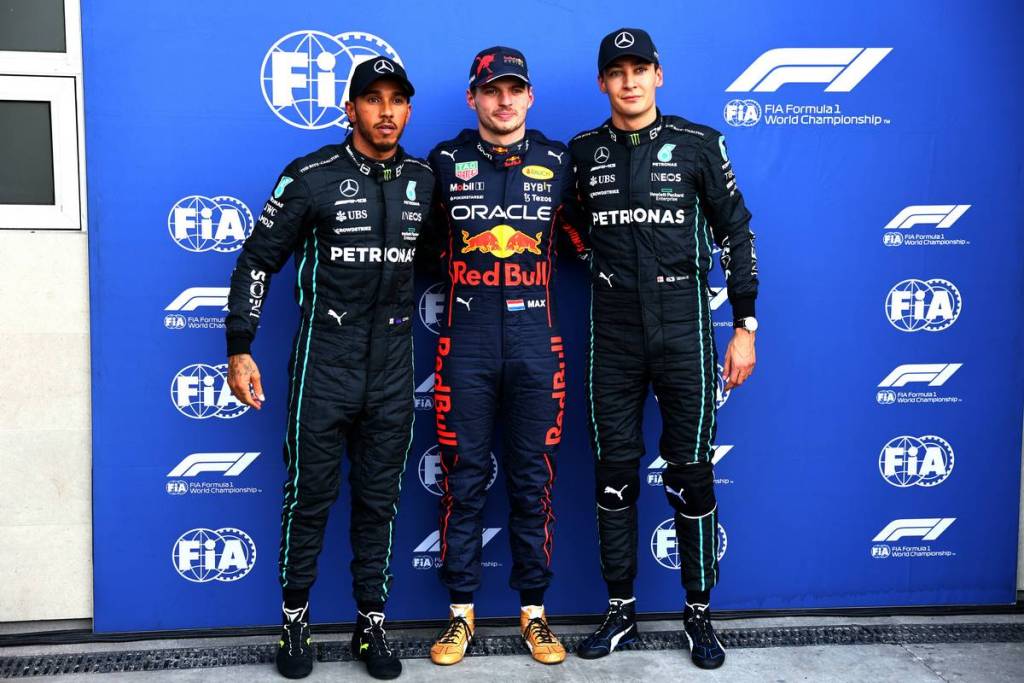 2022年F1第20戦メキシコGP予選 左から3番手ルイス・ハミルトン(メルセデス)、PPマックス・フェルスタッペン(レッドブル)、2番手ジョージ・ラッセル(メルセデス)