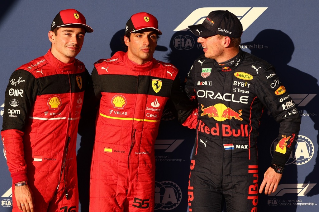 2022年F1第19戦アメリカGP予選トップ3 カルロス・サインツ(フェラーリ)、シャルル・ルクレール(フェラーリ)、マックス・フェルスタッペン(レッドブル)