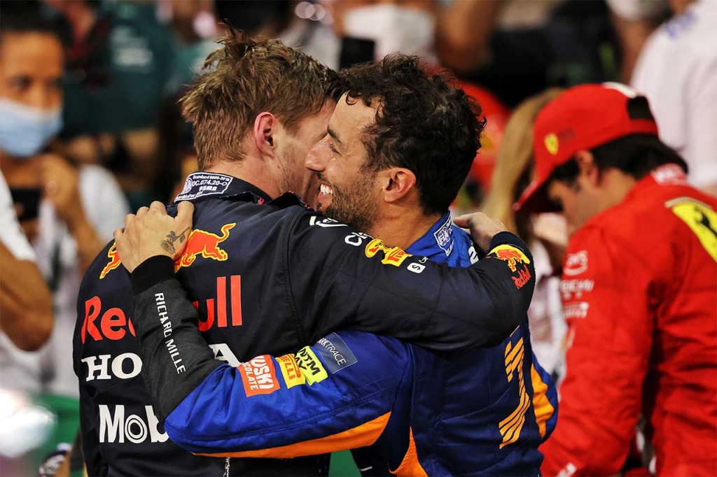 2021年F1アブダビGP マックス・フェルスタッペンのチャンピオン獲得を祝福するダニエル・リカルド