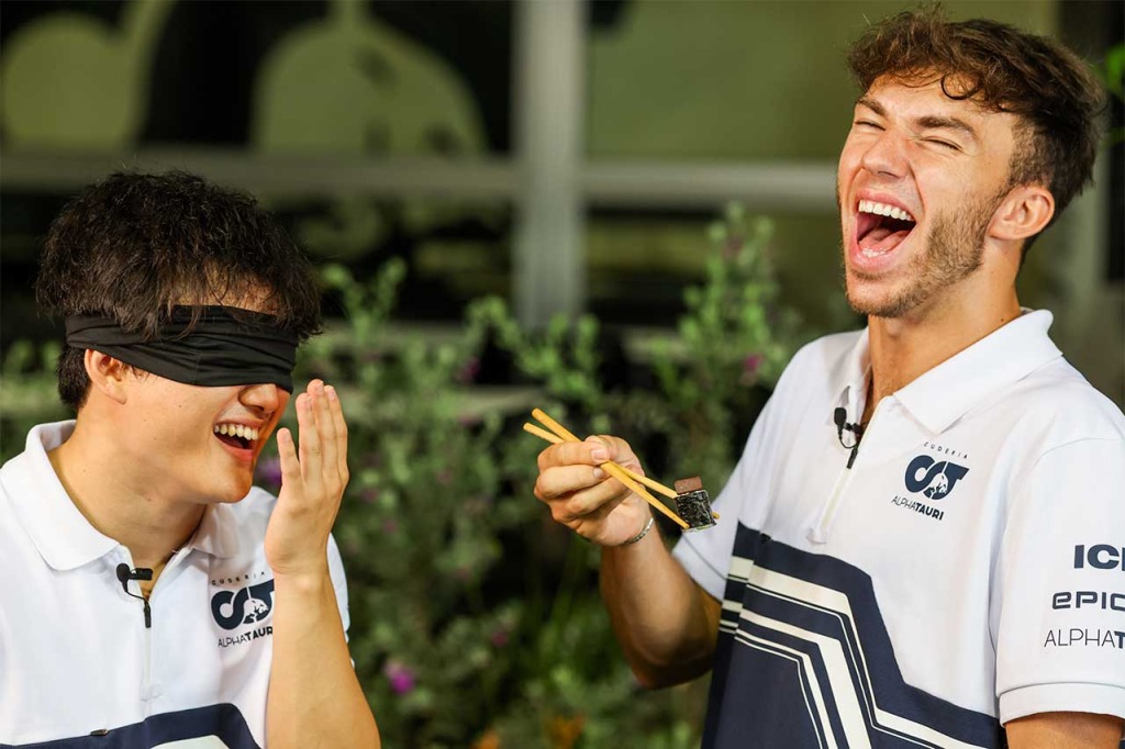 目隠し寿司ネタ当てを行う角田裕毅とピエール・ガスリー