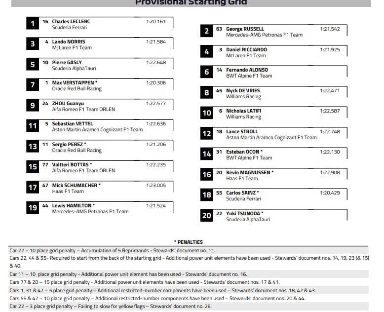 2022年F1第16戦イタリアGP予選暫定グリッド(土曜発表)