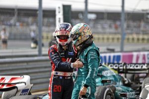 2022年F1第19戦アメリカGP 決勝のバトルの後、健闘を称えあうケビン・マグヌッセン(ハース)とセバスチャン・ベッテル(アストンマーティン)