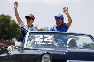 2022年F1第21戦ブラジルGPドライバーズパレード フェルナンド・アロンソ(アルピーヌ)と角田裕毅(アルファタウリ)