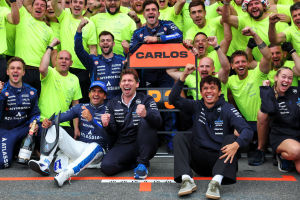 2025年F1第17戦アゼルバイジャンGP カルロス・サインツ(ウイリアムズ)の3位を祝うアレクサンダー・アルボンとチーム代表ジェームズ・ボウルズ