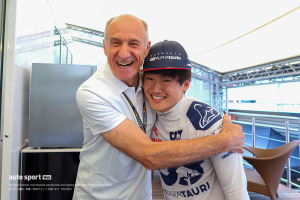 2023年ベルギーGP。前戦ハンガリーGPでの不甲斐ないレース後、見事入賞した角田裕毅を満面の笑みで抱きしめるアルファタウリのフランツ・リスト代表