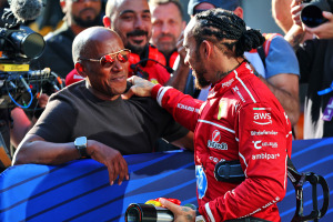 2025年F1第2戦中国GPスプリント予選 ポールポジションを喜ぶアンソニー・ハミルトンとルイス・ハミルトン(フェラーリ)
