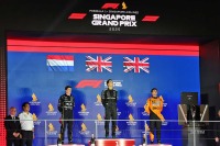 2025年F1第18戦シンガポールGP表彰式 優勝ジョージ・ラッセル(メルセデス)、2位マックス・フェルスタッペン(レッドブル)、3位ランド・ノリス(マクラーレン)