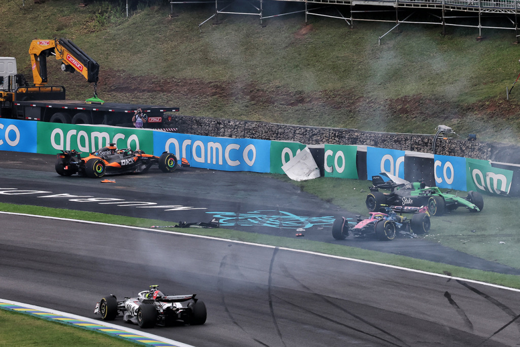 2025年F1第21戦サンパウロGP スプリントの6周目、ターン3で3台が単独スピンからクラッシュし赤旗中断