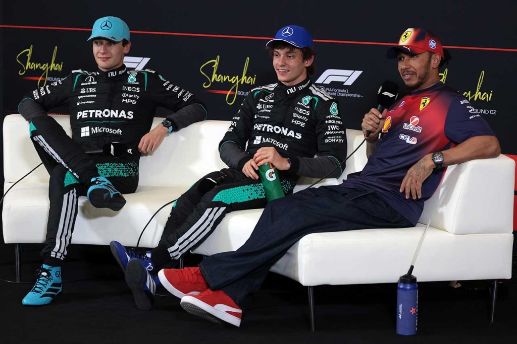 2026年F1第2戦中国GP予選後会見 左から2番手ジョージ・ラッセル(メルセデス)、PPアンドレア・キミ・アントネッリ(メルセデス)、3番手ルイス・ハミルトン(フェラーリ)