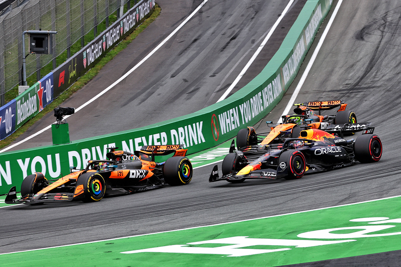 雲が上空を覆うなか、気温21度、路面温度29度、湿度69パーセントとなるなか、72周のレースはスタートを迎えた。ピアストリがターン1のホールショットを守るも、ソフトタイヤのフェルスタッペンが抜群の蹴り出しで2番手でターン1に飛び込んだ。