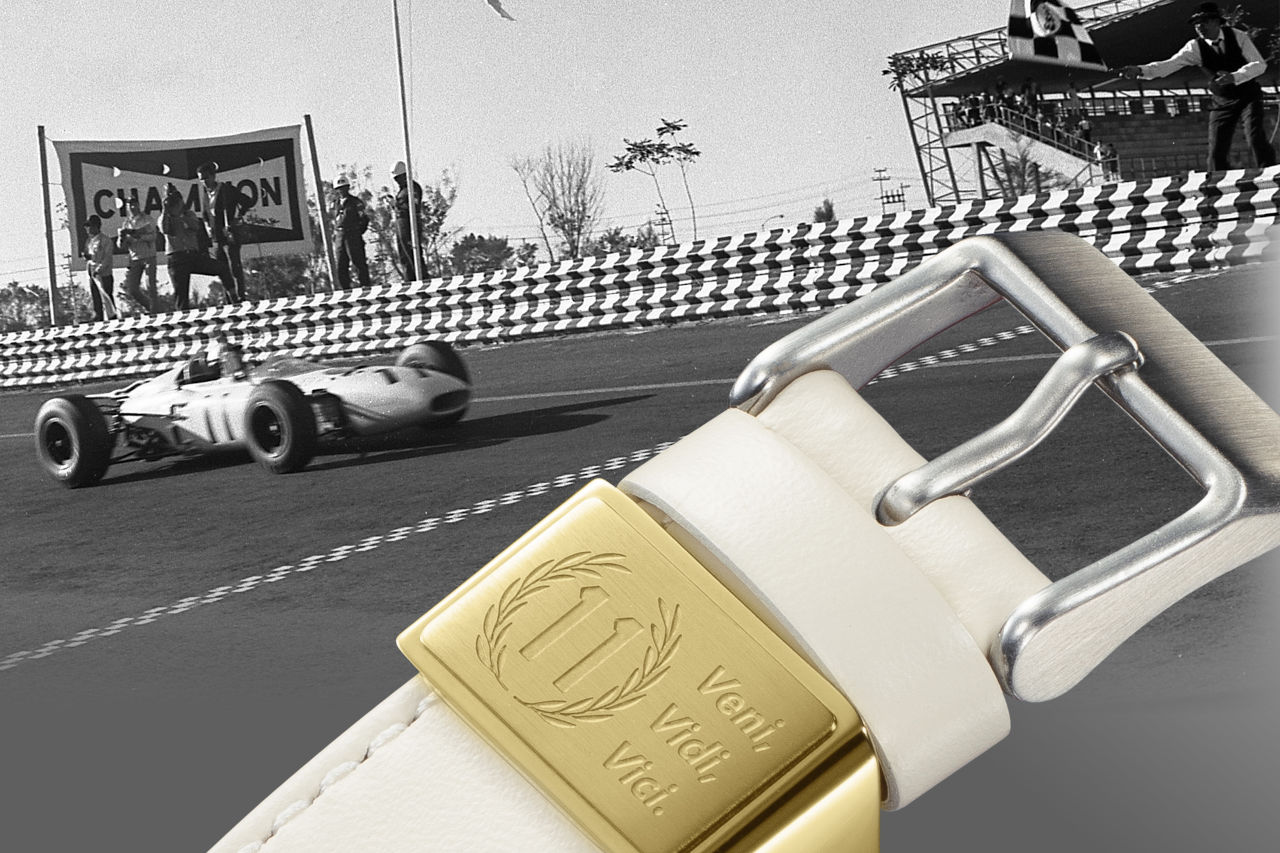 ゴールドのメタル遊環には、現地から本社に打電されたメッセージ「Veni, Vidi, Vici.(来た、見た、勝った)」とカーナンバーの『11』があしらわれたほか、ウルトラスエードを用いた剣先側バンドの裏面には当時としては異例であった1.5リッターV型12気筒エンジンの図面がデザインされた。