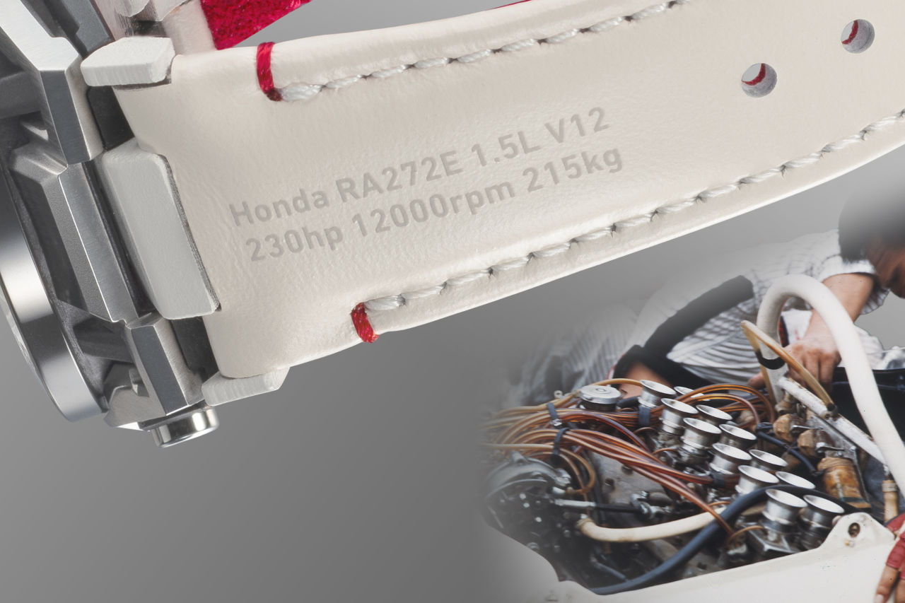 さらに、9時位置のインダイアルはRA272のタコメーターになぞらえ、針の形状やフォントまで実機の雰囲気を再現。裏蓋にはF1初優勝60周年を記念したホンダオリジナルのアニバーサリーロゴがレーザー刻印されている。