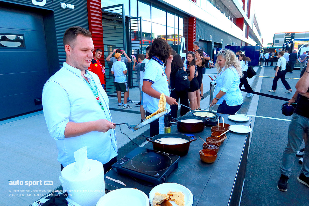 パドックに登場したパンケーキ屋台。真夏にパンケーキと思われる方もいるだろうが、じつはこの日のハンガロリンクの気温は最高でも約25度で、湿度も日中は30%台と過ごしやすく、パンケーキ日和なのだった。