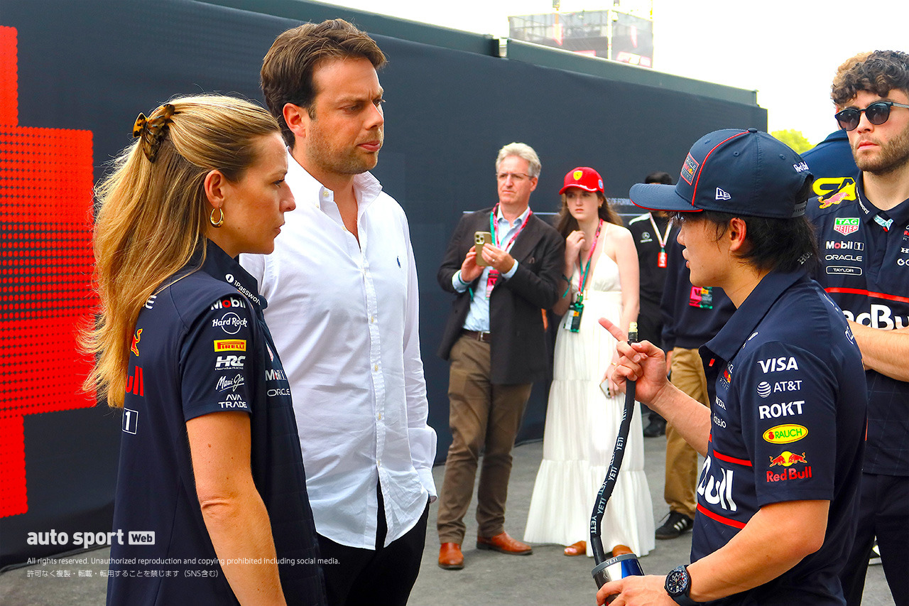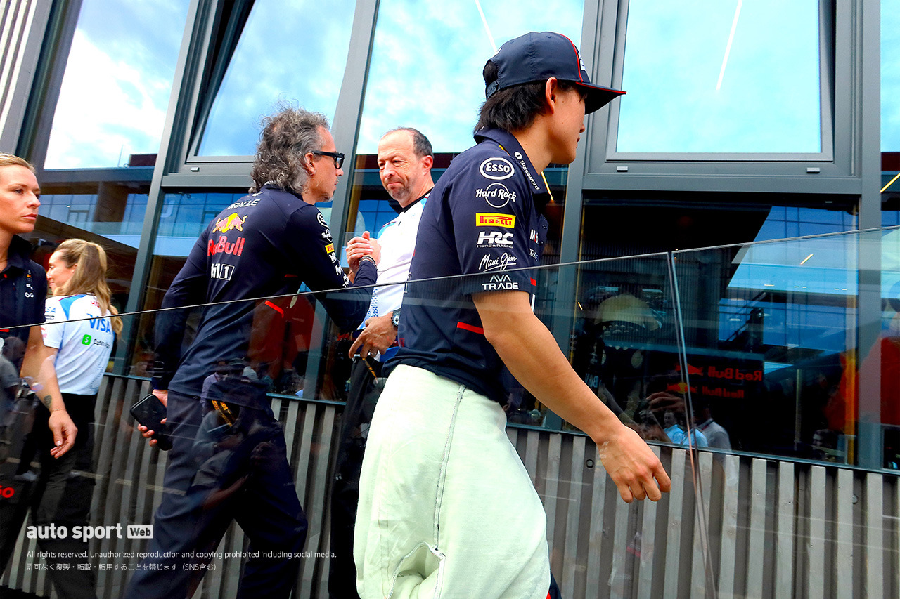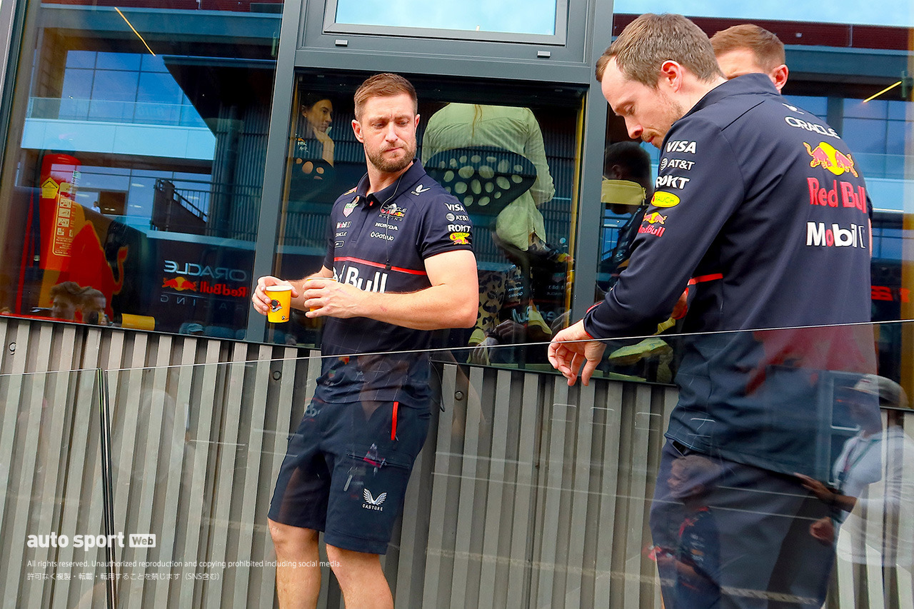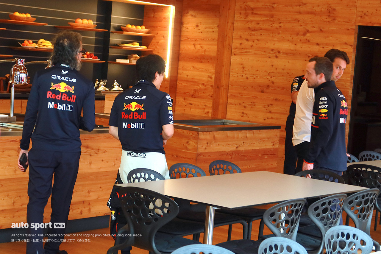 その取材を終えて、レッドブルのモーターホームへ移動すると、そこに角田のレースエンジニアを務めるウッドがいた。振り返ると、角田がローラン・メキース代表とともにモーターホームにやってきて、ウッドとともに3人でモーターホームの奥に消えていった。
