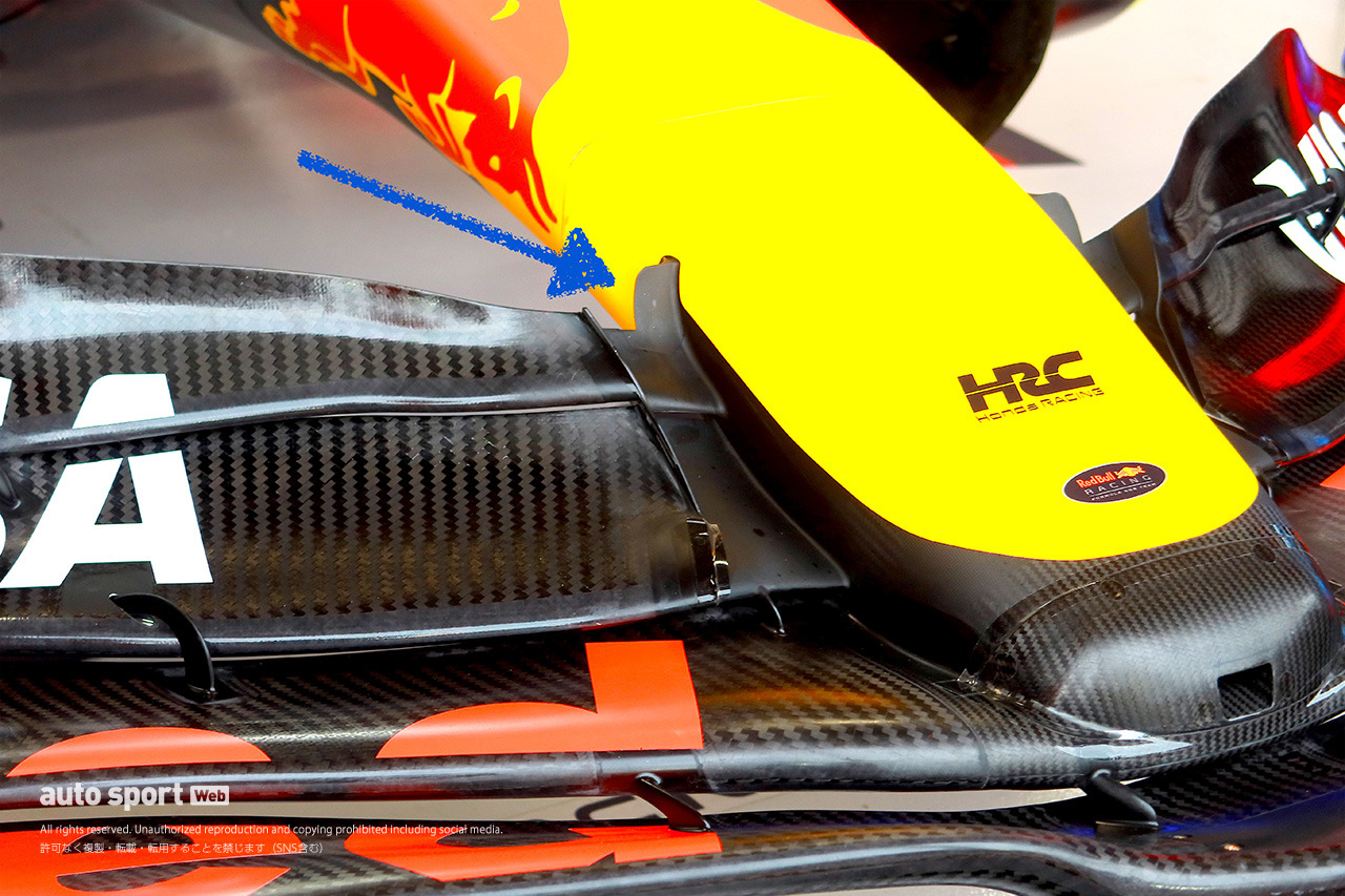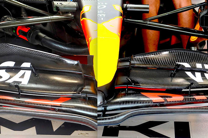 この新しいフロントウイングはアッパーフラップが変更されただけでなく、ノーズとの接着部分にカラーが付けられているのが特徴だ。これにより、フロントのダウンフォースが増え、もともと低速コースが弱点だったレッドブルのパフォーマンスが上がったと考えられる。