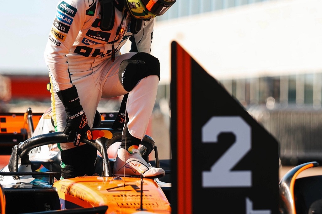 ノリスはFP1、スプリント予選SQ1、SQ2でトップタイムを記録したが、SQ3でマックス・フェルスタッペン(レッドブル)に0.071秒差で敗れた。