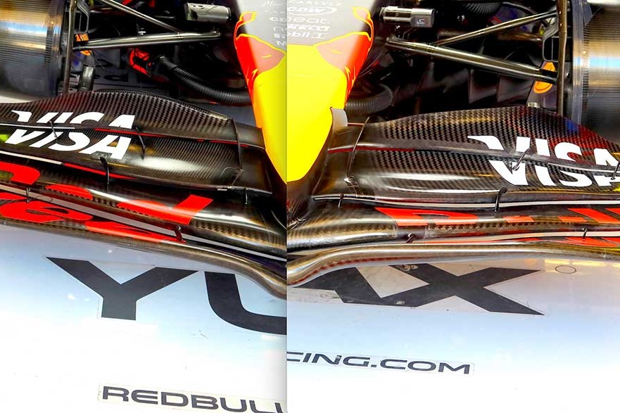 レッドブルのフロントウイングについて、ここ数戦のスペックを整理しよう。レッドブルは夏休み前の最後の1戦となったハンガリーGPにフェルスタッペンにだけアップデートされたフロントウイングを投入した。しかし、ハンガリー・スペックのフロントウイングは機能せず、金曜日のフリー走行後にイギリスGPまで使用していた旧式に戻していた。