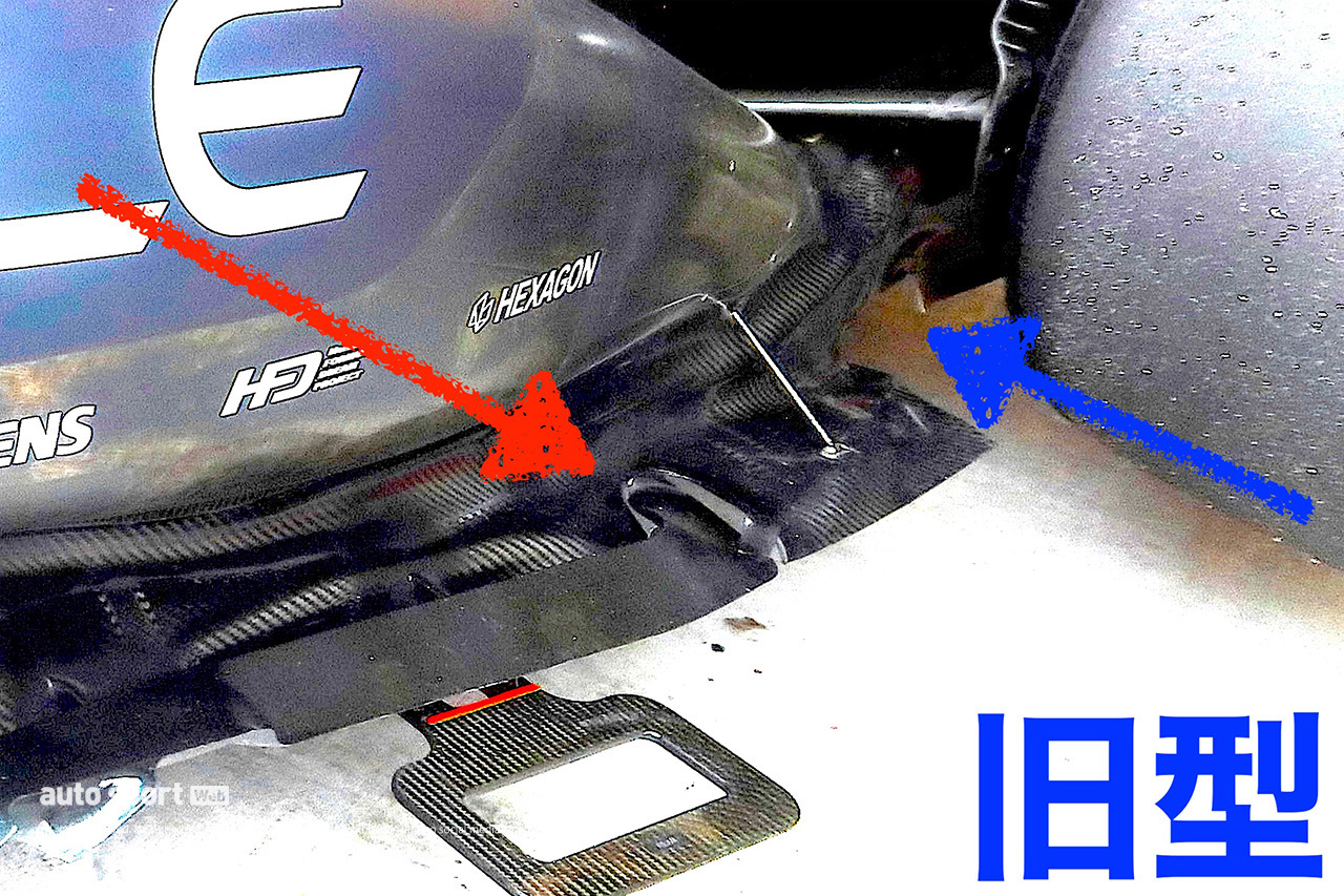 まずサイドポッドとの結合部分の形状がまったく異なっている。旧型では出っ張りやくぼみがあってやや波状になっていた(写真1の赤矢印)。それが新型では出っ張りやくぼみがなくなり、きれいな弓状に変更されている(写真2の赤矢印)。