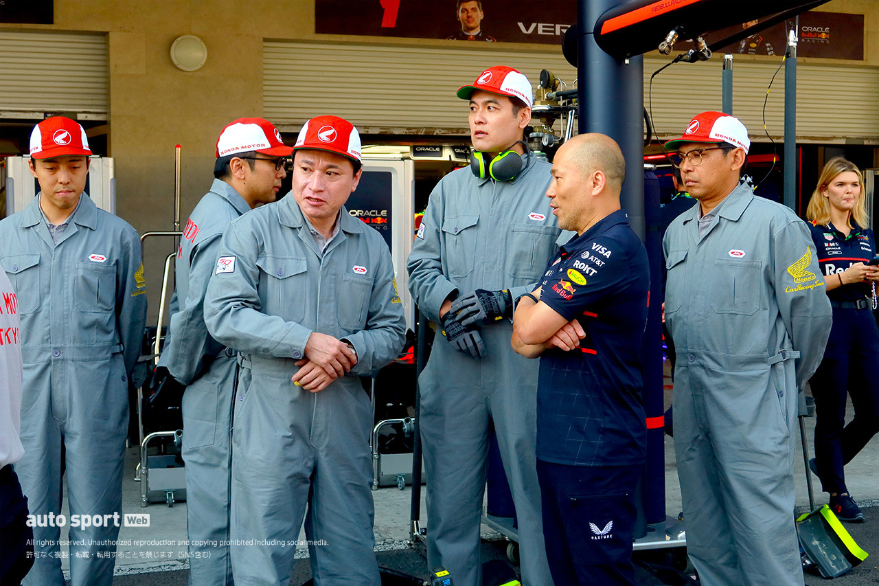 ホンダ・レーシング(HRC)の渡辺康治社長とRA272を見ているのは、角田裕毅のPUシステムエンジニアを担当している久保哲宏。