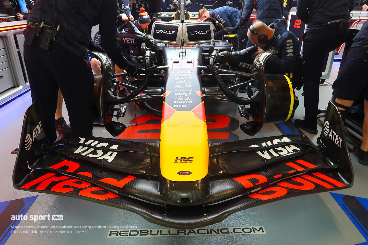 異なるセットアップのひとつが、フロアの違いだ。今回レッドブルはラスベガス・ストリップ・サーキットに合わせて、モンツァ仕様をモディファイしたラスベガス仕様のフロントウイングを持ち込んだ。これはフェルスタッペンだけでなく、角田も使用していた。