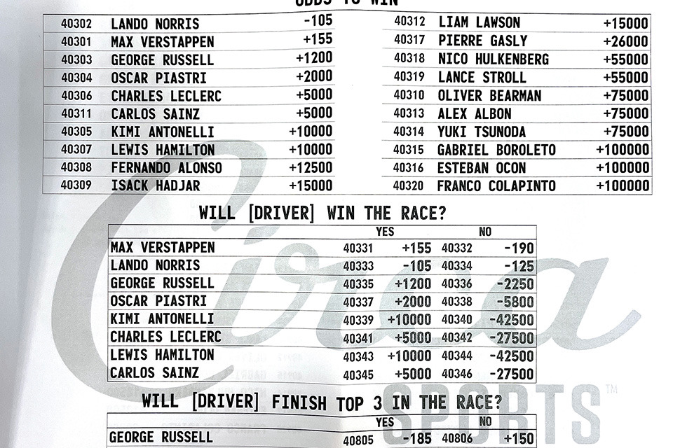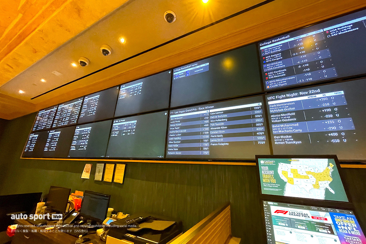 2025年F1第22戦ラスベガスGP期間中にメディアセンターが設置されているタスカニー・スイーツ&カジノにあるスポーツベットによれば、一番人気は金曜日までのマックス・フェルスタッペン(レッドブル)から変更され、11月22日(土)午後1時の段階で、一番人気はランド・ノリス(マクラーレン)となった。そのオッズは『-105』。マイナス記号(-)は、その対象が勝つ確率が非常に高い「本命」であることを示し、ノリスの『-105』というオッズは、100ドルの利益を得るために105ドルを賭ける必要があることを意味する。アメリカのスポーツブックは、賭けに勝つとオッズ分が配当されるだけでなく、賭けたお金も返金されるので、ノリスに105ドル賭けると、配当金の100ドルと賭けた105ドルの合わせて205ドルが返ってくる。