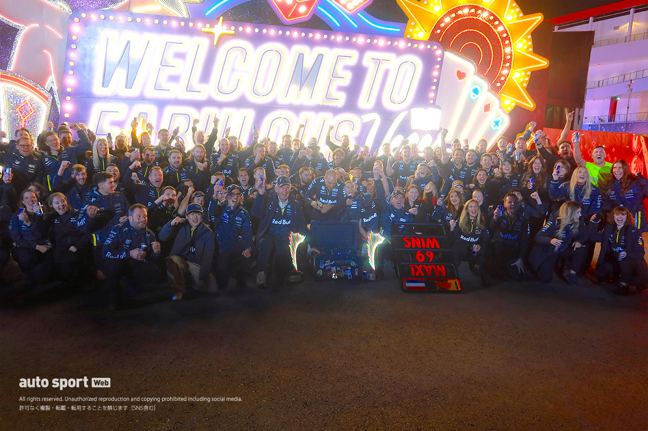 ラスベガスGPはチームメイトのマックス・フェルスタッペンが優勝。レース後に行われた記念撮影会場に少し遅れて到着した角田は、最前列の端におとなしく座った。すると、それに気づいたローラン・メキース代表が角田を呼び寄せ、隣に座らせた。