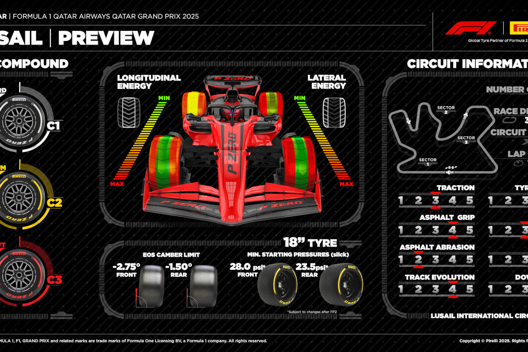イタリアのタイヤメーカーは、プレビューのなかで次のように述べた。「レースウイーク開始時にチームに供給されるタイヤ各1セットあたり、ルサイルのコースを最大25周走行できる。周回数は、セーフティカー(SC)またはバーチャルセーフティカー(VSC)の下でのラップを含め、すべてのトラックセッションにわたって累積的にカウントされる」