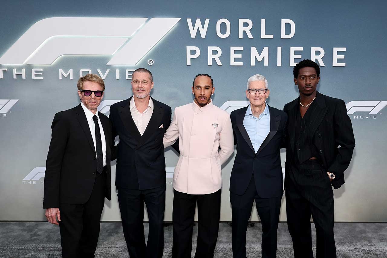 『F1/エフワン』のワールドプレミアに参加したジェリー・ブラッカイマー(プロデューサー)、ブラッド・ピット、ルイス・ハミルトン、ティム・クック(Apple社CEO)、ダムソン・イドリス