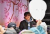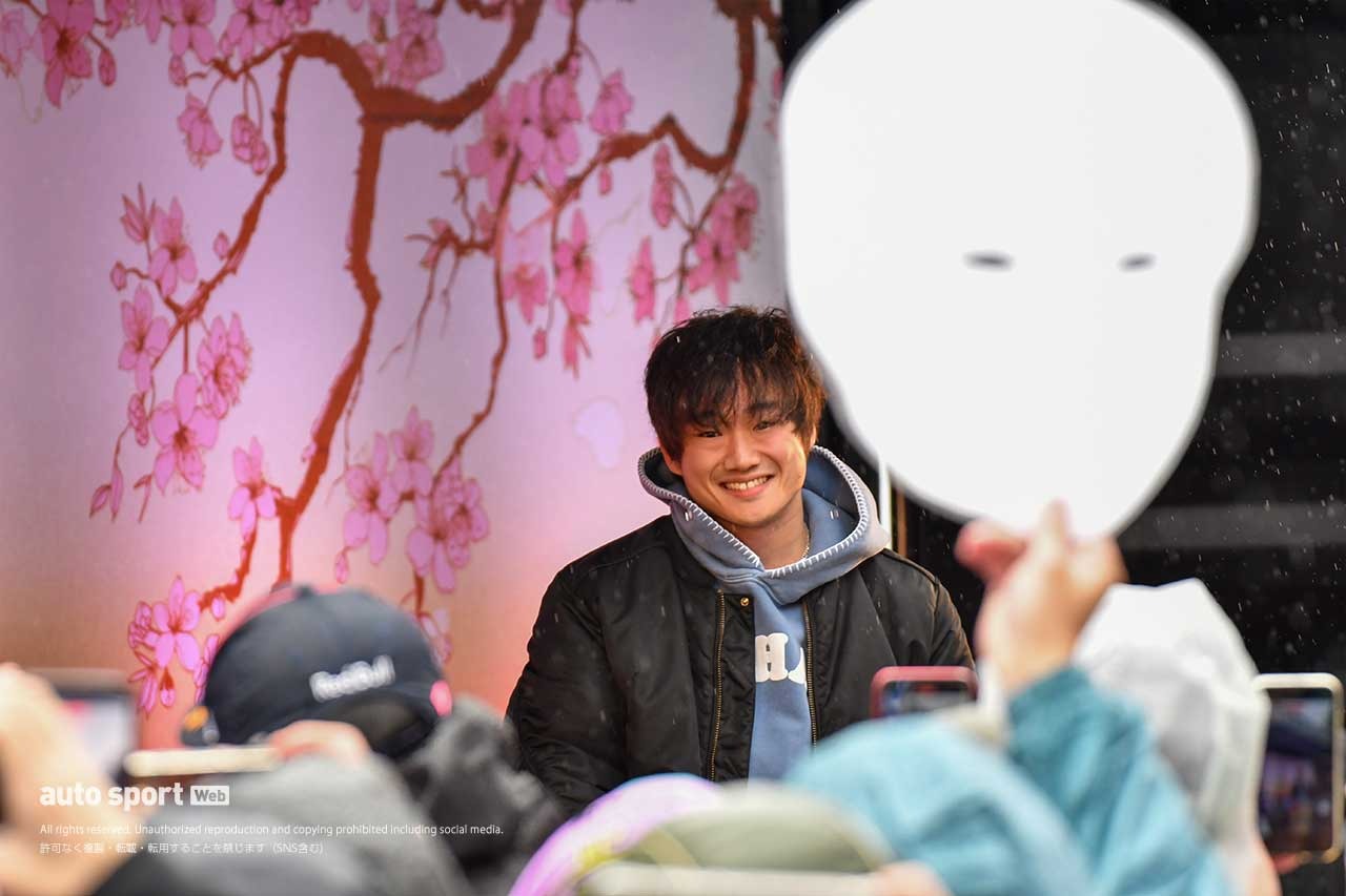 13時から行われた小林可夢偉のトークショーに続き、14時からステージに登場した角田は、まず「あいにくの雨ですが……日本(の天気は)アップダウンが激しいですよね。(日本GPのあとの)中東ラウンドがキャンセルになってしまったので、いつもより長めに日本にいられます。桜も見られそうなので、楽しみです」と挨拶。